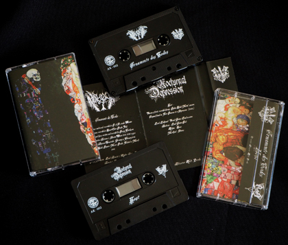 Split with Depressive Black Metal formation from France Nocturnal Depression. All music and lyrics on Moloch side written & recorded between Autumn/Winter 2015-2016. All Guitars (Lead, Rhythm, Acoustic), Bass (Acoustic, Distorted) and Vocals recorded at S.o.h.D. studio (Ukraine) by Sergiy Fjordsson. Drums recorded at BeastCave Studio (Italy) by Gionata Potenti. Mixing at Abgrund-Tonstudio (Germany) in February 2016. Mastered at Black-Square-Music-Studio (Finland) in March 2016. Nocturnal Depression track is a version of 2015 recorded during “Spleen Black Metal” session. Original found on “Four Seasons to a Depression” (2006). Recorded with Avskrius, Krahne, Morkhod and Lord Lokhraed. The sound and tonality of each instrument, as well as structure of the composition itself on the MOLOCH track "Ornamente des Todes (Ornaments of Death / Орнаменти Смерті)", were written, composed and recorded in such a way that this track could be played at both standard vinyl speed (33⅓ or 45 rpm). Sound and whole atmosphere of the composition on 33⅓ and 45 rpm speed will be completely different from each other.